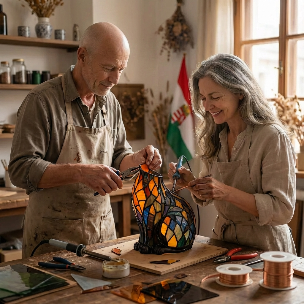 - Anyag és dizájn: vitrázs üveg lámpatest és masszív ötvözet alap